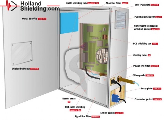 Οι διαθέσιμες (οι περισσότερες ενσωματωμένες) επιλογές είναι: φίλτρα ηλεκτρικής τροφοδοσίας, φίλτρα γραμμής σήματος, θωρακισμένος κυψελοειδής αερισμός, κυματοδηγοί (waveguides) για τη διέλευση καλωδίων οπτικών ινών, φίλτρο γραμμής δεδομένων UDP, οπτικός μετατροπέας USB 3.0, σταθερά / συρόμενα ράφια κλπ
