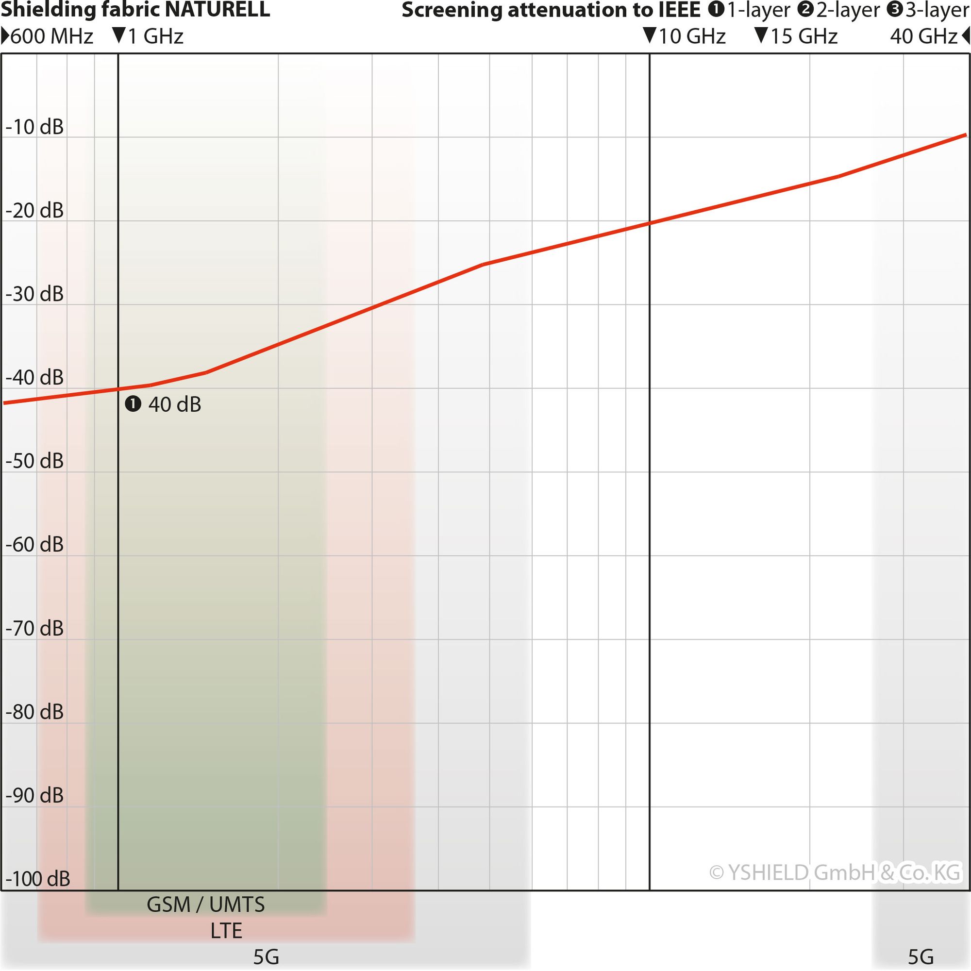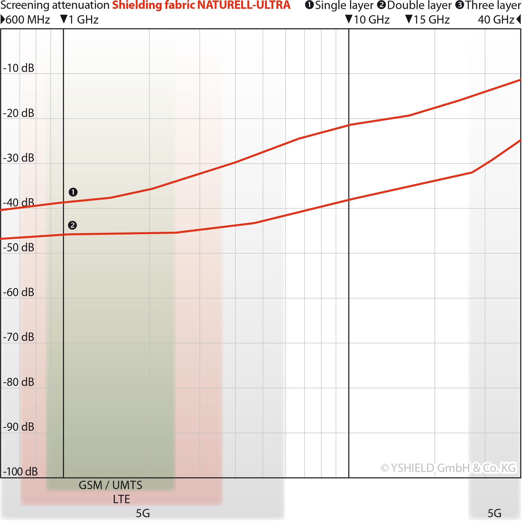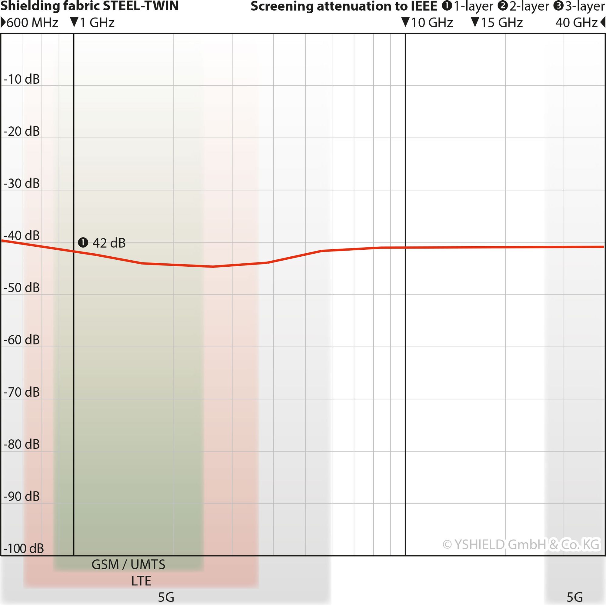 • Ποσοστό θωράκισης: 44 dB (Οι υποδεικνυόμενες τιμές dB ισχύουν για 1 GHz, δείτε στις φωτογραφίες του υφάσματος διάγραμμα θωράκισης για άλλες συχνότητες. Αναφορά εργαστηρίου που κυμαίνεται από 40/600 MHz έως 40 GHz σύμφωνα με τα πρότυπα ASTM D4935-10 ή IEEE Std 299-2006). Δείτε το πιστοποιητικό θωράκισης εδώ.