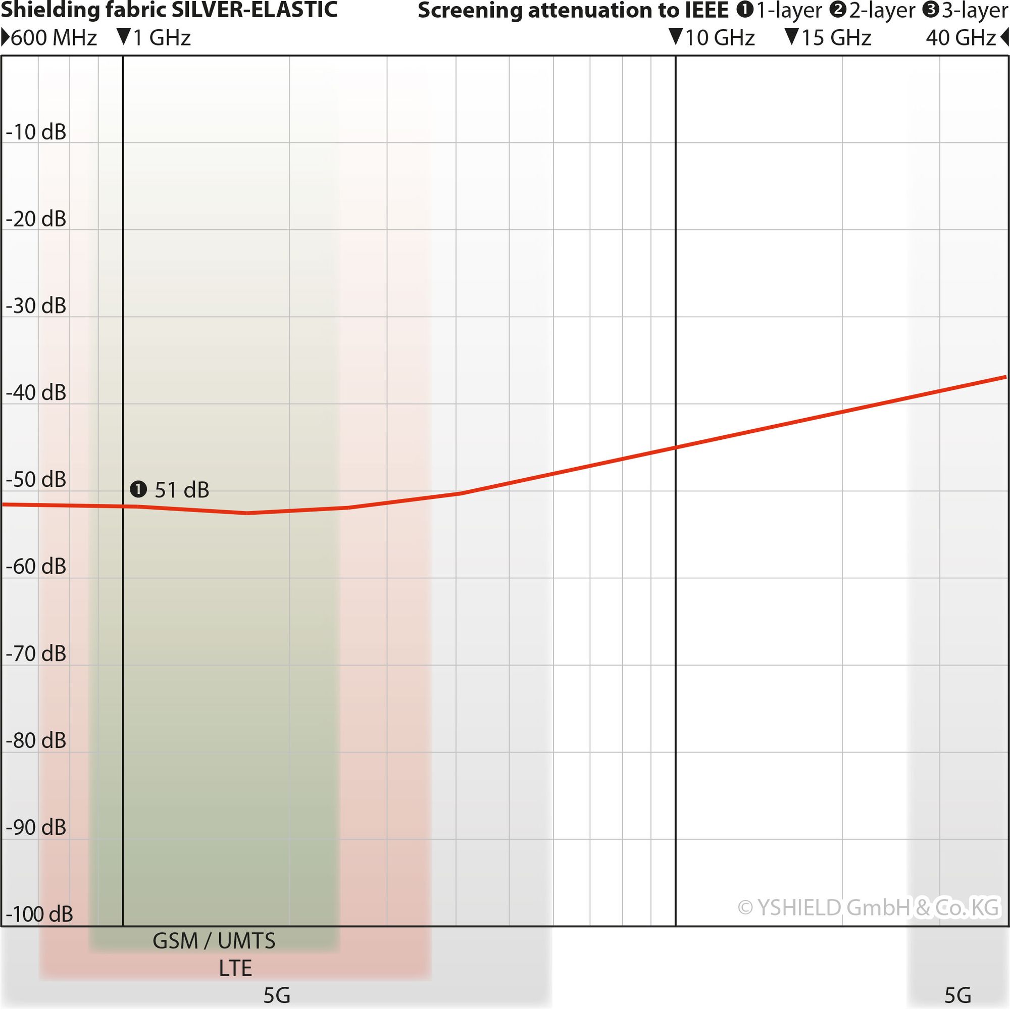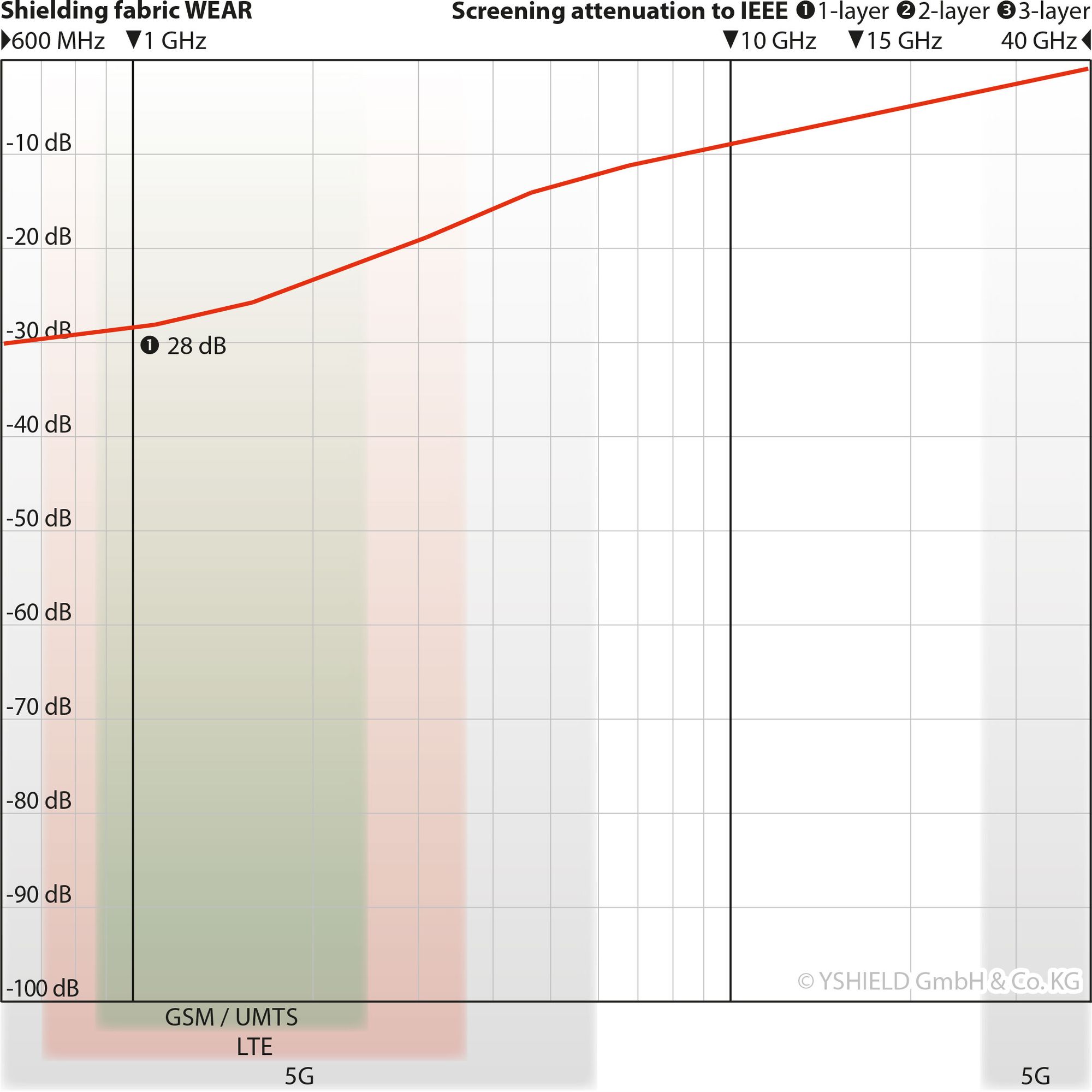 • Ποσοστό θωράκισης: 28 dB (Οι υποδεικνυόμενες τιμές dB ισχύουν για 1 GHz, δείτε στις φωτογραφίες του υφάσματος διάγραμμα θωράκισης για άλλες συχνότητες. Αναφορά εργαστηρίου που κυμαίνεται από 40/600 MHz έως 40 GHz σύμφωνα με τα πρότυπα ASTM D4935-10 ή IEEE Std 299-2006). Δείτε το πιστοποιητικό θωράκισης εδώ.