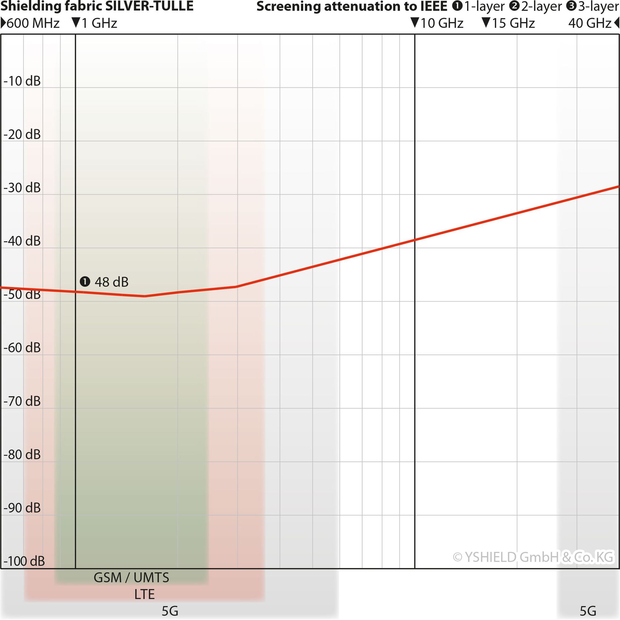 • Ποσοστό θωράκισης: 60 dB (Οι υποδεικνυόμενες τιμές dB ισχύουν για 1 GHz, δείτε στις φωτογραφίες του υφάσματος διάγραμμα θωράκισης για άλλες συχνότητες. Αναφορά εργαστηρίου που κυμαίνεται από 40/600 MHz έως 40 GHz σύμφωνα με τα πρότυπα ASTM D4935-10 ή IEEE Std 299-2006). Δείτε το πιστοποιητικό θωράκισης εδώ.