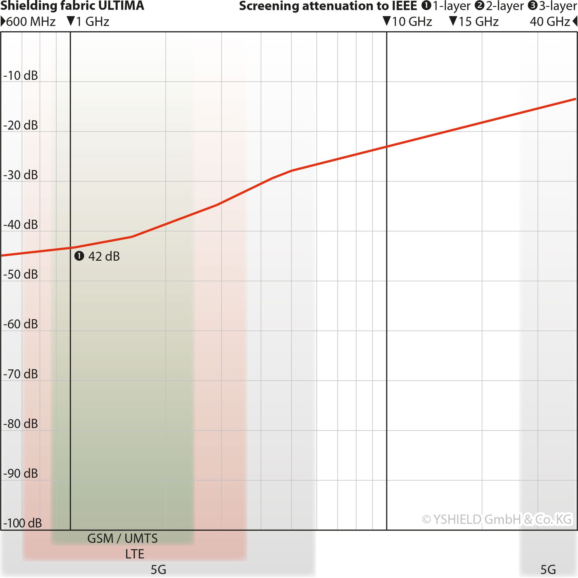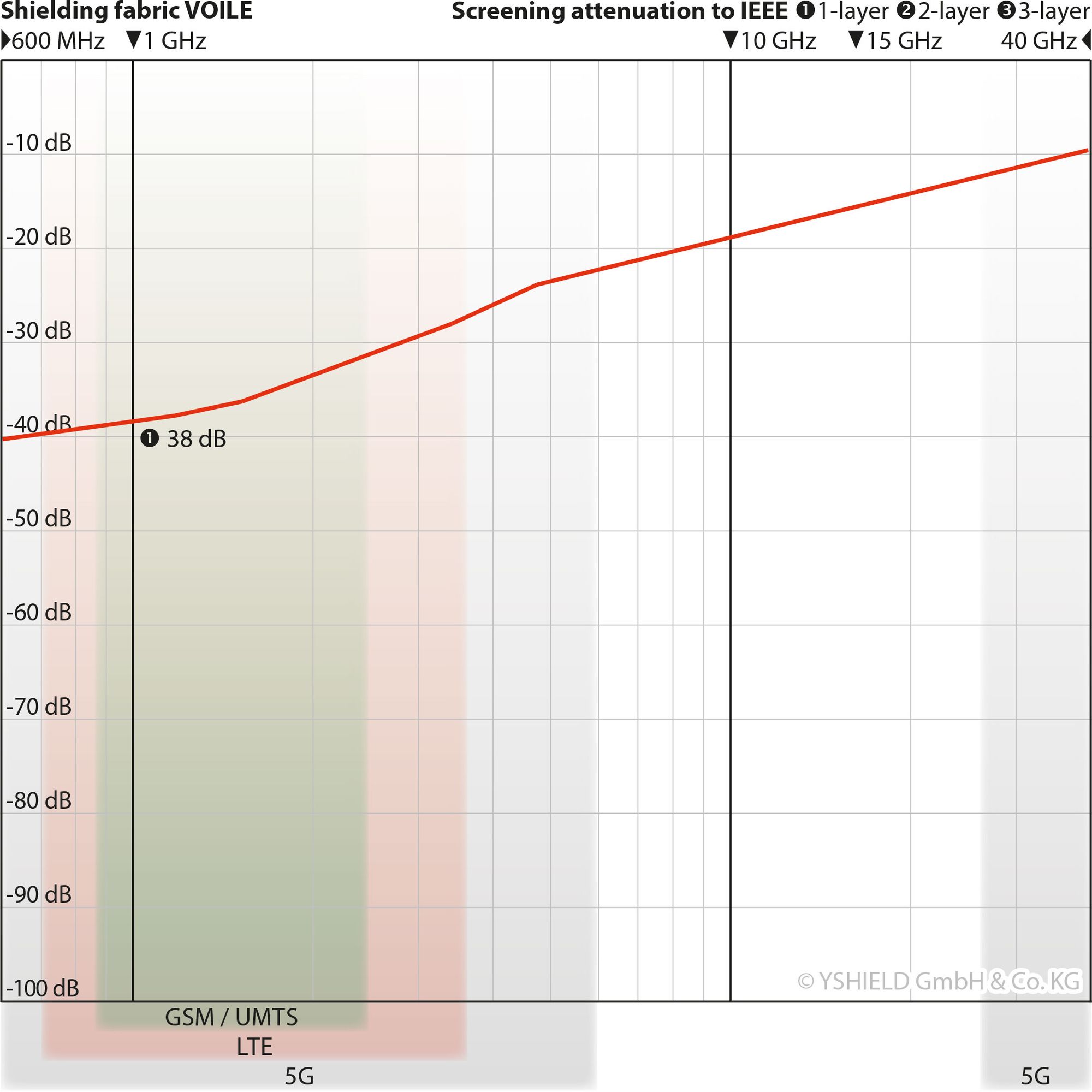 • Ποσοστό θωράκισης: 38 dB (Οι υποδεικνυόμενες τιμές dB ισχύουν για 1 GHz, δείτε στις φωτογραφίες του υφάσματος διάγραμμα θωράκισης για άλλες συχνότητες. Αναφορά εργαστηρίου που κυμαίνεται από 40/600 MHz έως 40 GHz σύμφωνα με τα πρότυπα ASTM D4935-10 ή IEEE Std 299-2006) Δείτε το πιστοποιητικό θωράκισης εδώ.