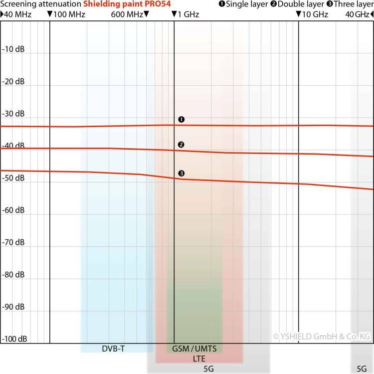 Δείτε αναλυτικά τα διαγράμματα θωράκισης ανά συχνότητα (40 MHz - 40GHz) για βαφή με 1, 2 ή 3 χέρια μπογιάς HSF54, που μετρήθηκε σύμφωνα με το πρότυπο ASTM-D4935-10 (30dB=99,9% μείωση, 40dB=99,99% μείωση, 50dB=99,999% μείωση) στις φωτογραφίες του προϊόντος.